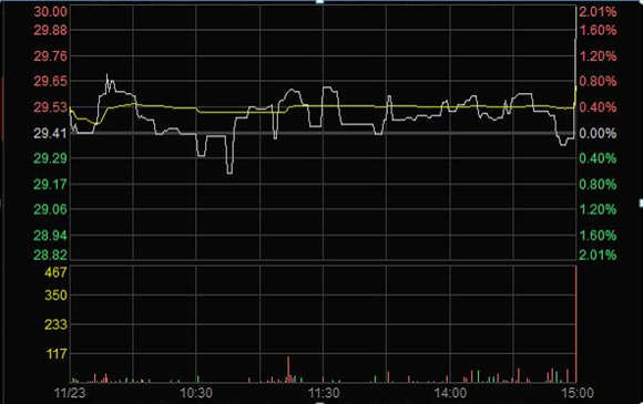 2011年11月23日臨近收盤期間(14:56:24至14:59:28),任某某為了在短期內(nèi)拉升股價(jià),大量申報(bào)買入“X”4筆共計(jì)63,000股,占尾市階段市場申買量的比例高達(dá)75.54%;委托價(jià)格由29.60元升至32.00元,每筆均高于當(dāng)時(shí)市場上的買1檔價(jià)格,三分鐘內(nèi)將股價(jià)由29.35元拉升至30元收盤,拉升幅度達(dá)2.21%。(見下圖)